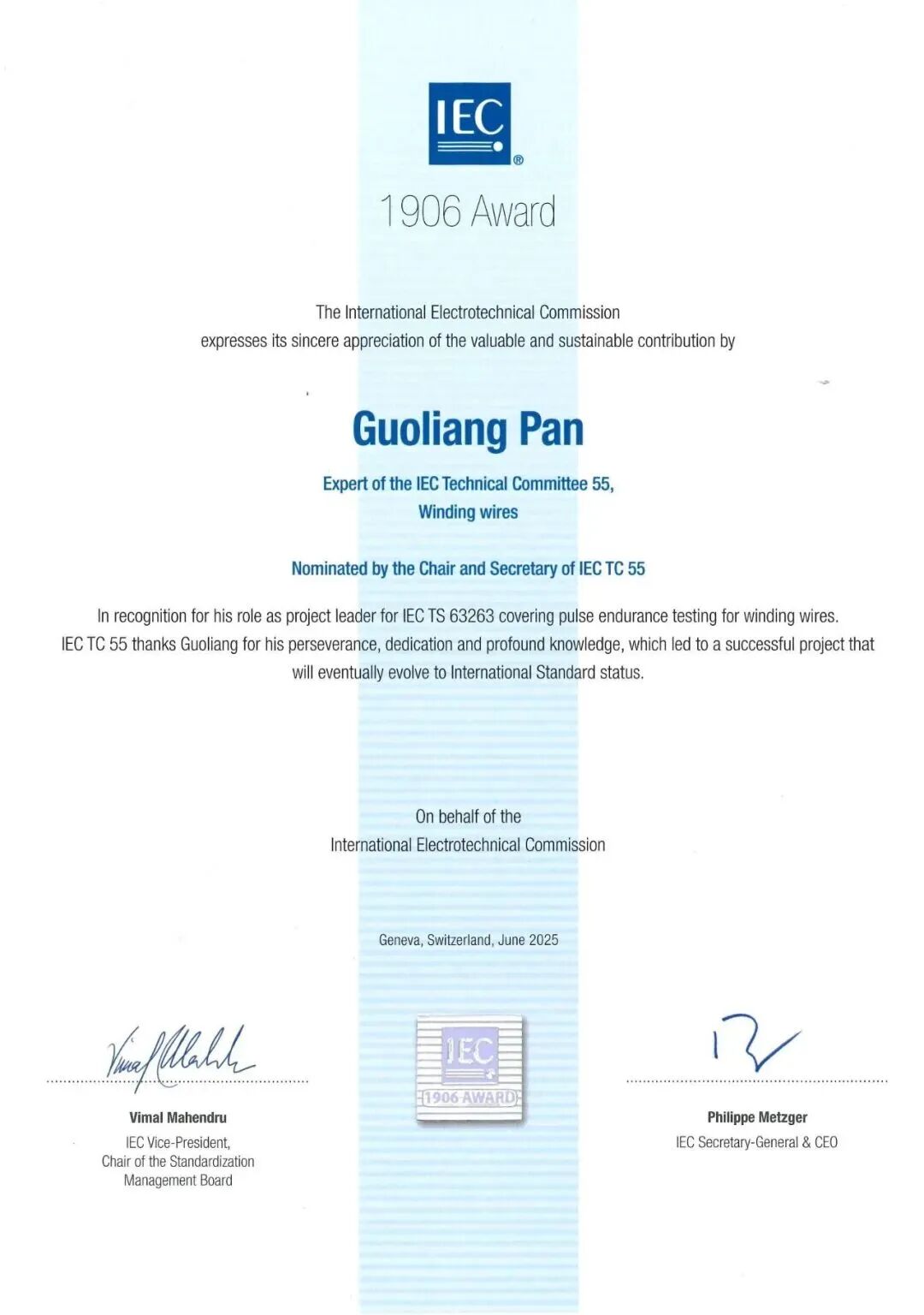 近日,国际电工委员会(IEC)2025年度“IEC 1906奖”评选结果揭晓。经IEC/TC55(绕组线技术委员会,以下简称:TC55)主席和秘书处推荐,上缆所旗下上海国缆检测股份有限公司高级工程师潘国梁凭借在绕组线国际标准化工作中作出的贡献获得该奖项,也是本年度全国绕组线领域唯一获此奖项的专家。