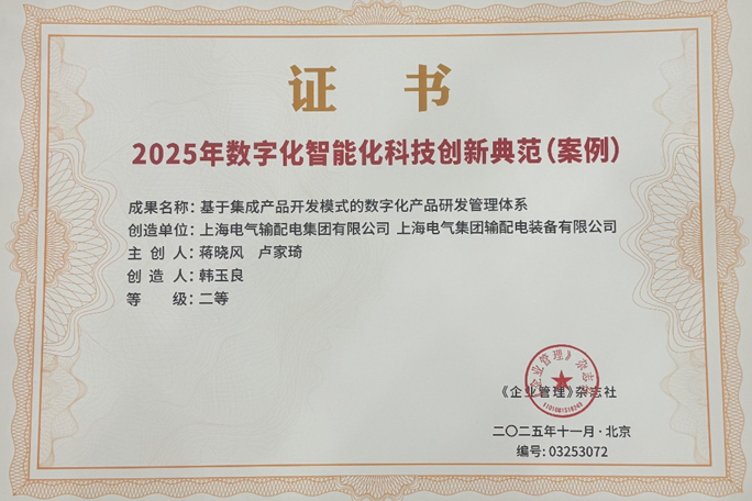 近日,上海电气输配电集团有限公司与上海人民电器厂的两项成果经权威遴选,成功获评“2025年数字化智能化科技创新典范(案例)”,相关成果已被收录于《2025-2026国资国企改革创新成果案例汇编》,将作为先进实践案例向全国发布、推广。此次入选,标志着集团在持续提升“高端化、国产化、智能化、集成化”核心竞争力发展道路上取得了重要进展,展现了集团在数字化智能化领域的领先实力与创新引领能力。