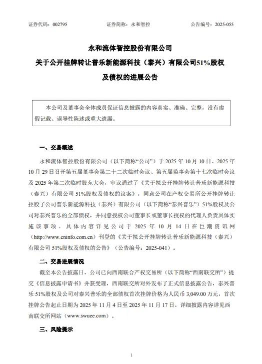 11月4日,永和智控(002795)公告称,公司于2025年10月10日、2025年10月29日召开第五届董事会第二十二次临时会议、第五届监事会第十七次临时会议及2025年第二次临时股东大会,审议通过了《关于拟公开挂牌转让普乐新能源科技(泰兴)有限公司51%股权及债权的议案》,同意公司在产权交易所公开挂牌转让控股子公司普乐新能源科技(泰兴)有限公司(以下简称“泰兴普乐”)51%股权及公司对泰兴普乐的全部债权,并同意授权公司董事长或董事长授权的代理人负责具体实施该事项。